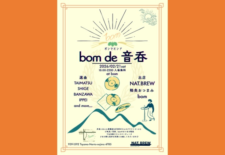 「土着醸造」を唱う井波のブリュワリー、NAT.BREW@nat.brew_inami のクラフトビールと心地よいGOOD MUSIC 、bomのおつまみ軽食をまとめて楽しめる、週末土曜のお気軽ラウンジパーティー。bomで“楽しい“、“美味しい“、“心地よい“時間を過ごしませんか!