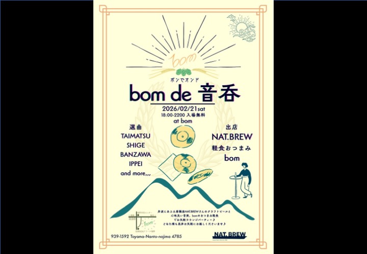 「土着醸造」を唱う井波のブリュワリー、NAT.BREW@nat.brew_inami のクラフトビールと心地よいGOOD MUSIC 、bomのおつまみ軽食をまとめて楽しめる、週末土曜のお気軽ラウンジパーティー。bomで“楽しい“、“美味しい“、“心地よい“時間を過ごしませんか!